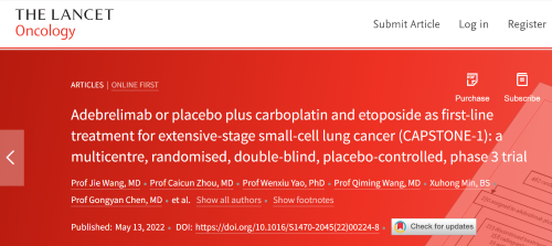 北京时间2022年5月14日,利来w66国际医药自主研发的PD-L1抑制剂阿得贝利单抗治疗广泛期小细胞肺癌的III期临床研究(CAPSTONE-1研究)成果正式全文在线发表于国际权威学术期刊《柳叶刀·肿瘤学》(《THE LANCET Oncology》,影响因子41.316)。CAPSTONE-1研究结果显示,阿得贝利单抗联合化疗一线治疗广泛期小细胞肺癌相较于安慰剂联合化疗可以显著延长患者总生存期至15.3个月[1],刷新现有免疫药物一线治疗广泛期小细胞肺癌的总生存纪录[2]