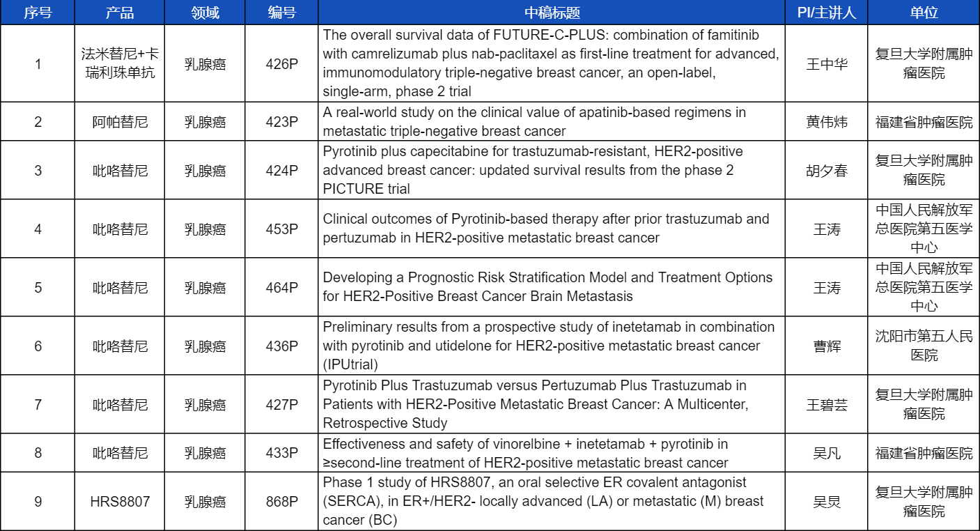 12款抗肿瘤创新药包括6款已上市产品:注射用卡瑞利珠单抗(艾瑞卡®)、甲磺酸阿帕替尼片(艾坦®)、马来酸吡咯替尼片(艾瑞妮®)、阿得贝利单抗注射液(艾瑞利®)、氟唑帕利胶囊(艾瑞颐®)、瑞维鲁胺片(艾瑞恩®),以及6款未上市产品:多靶点受体酪氨酸激酶抑制剂法米替尼、抗PD-L1/TGF-βRII双抗SHR-1701、组蛋白甲基转移酶EZH2抑制剂SHR2554、HER2抗体偶联药物(ADC)SHR-A1811、HER3抗体偶联药物SHR-A2009、新型选择性雌激素受体共价拮抗剂(SERCA)HRS8807等。此次ESMO大会的最新突破摘要(LBA)结果尚未披露,敬请期待!本文特对33项研究成果做了梳理,带领各位读者领略利来w66国际医药创新之光。