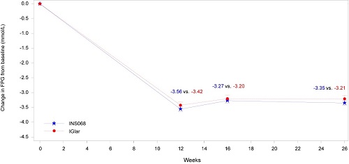 治疗26周后,INS068组FPG降幅大于IGlar组(均值变化:-2.40 mmol/L vs -1.96 mmol/L;两组差值:-0.45 mmol/L,95% CI:-0.74,-0.16)。